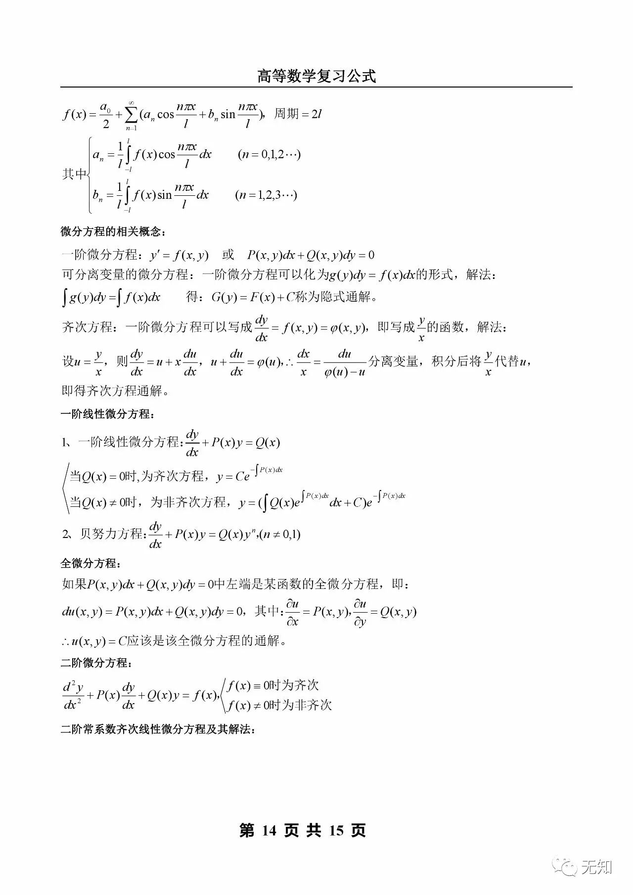 傅里叶级数|微分方式的相关概念|一阶线性微分方程|全微分方程|二阶微分方程|二阶齐、非齐次线性微分方程